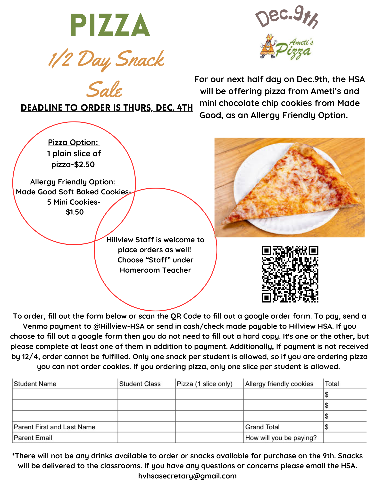 The HSA will be offering full size pretzels from the Philly Pretzel Factory (Thursday, 11/13), and pizza from Ameti's Pizza (Friday, 11/14), and an allergy friendly soft baked cookie option from Made Good (both days). There will also be the option for gluten-free pretzel from Defying Gravitea for Thursdays sale.