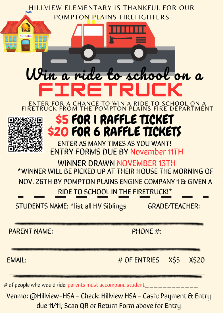 Enter for a chance to win a ride to school on a firetruck from the Pompton Plains Fire Department! Families with multiple students in Hillview can use 1 form and list all siblings.